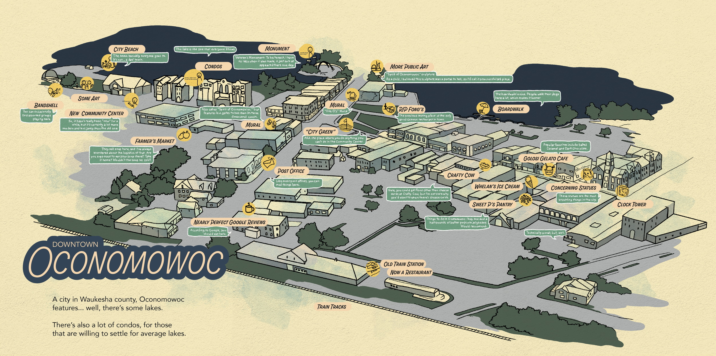 Hand-rendered map of Oconomowoc’s downtown and it’s very clearly most important features.